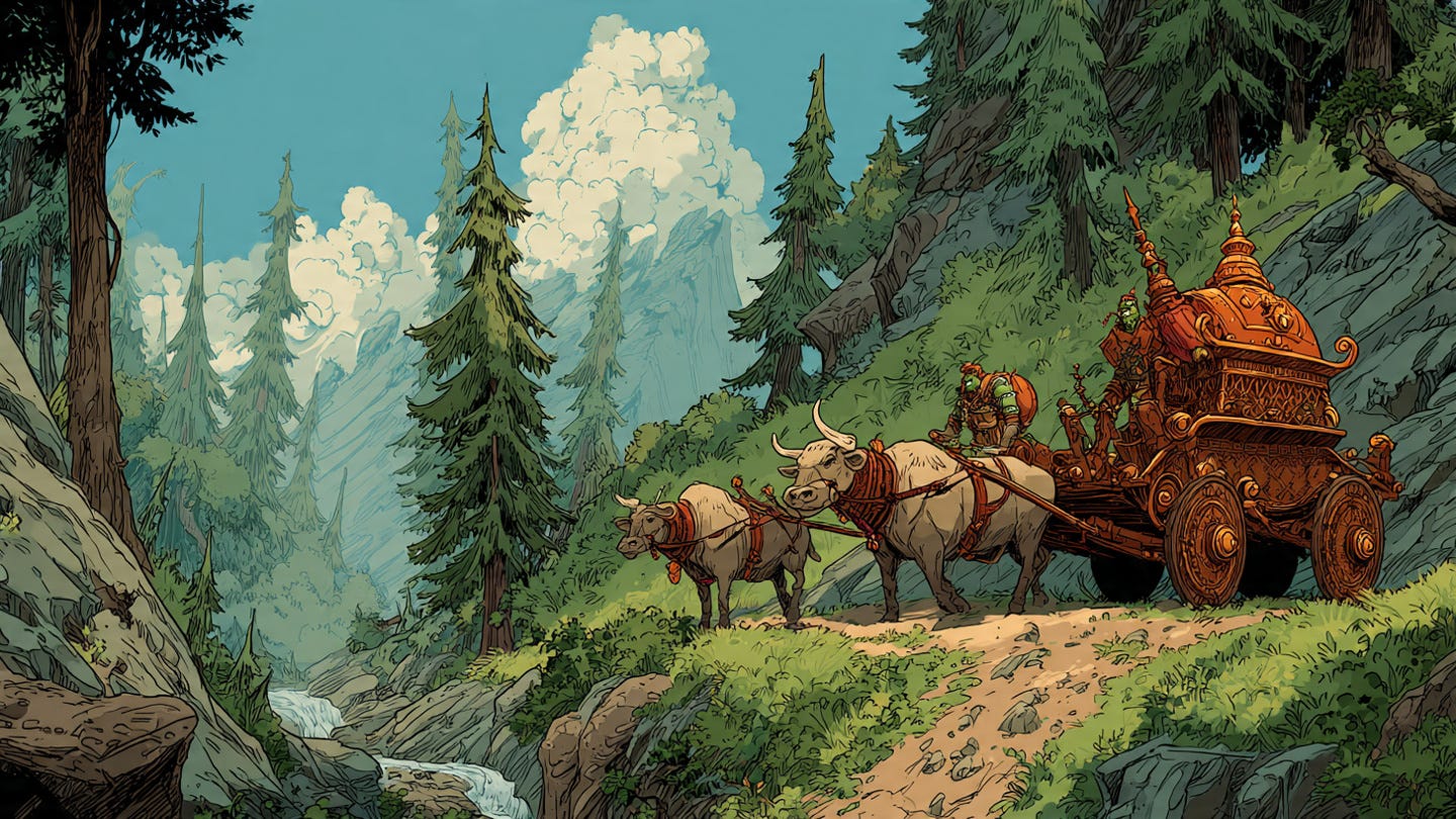 Outside, the driver clucked and called to the oxen, guiding the cart along the rising trail. Gheen caught the occasional faint slap of the whip, reminding the yoked team of beasts of their duty. This brought a smile to the Holy One. Until he’d come to know Gabriel Cullen, he’d seen the pakh-hu as cattle to be driven. That’s what trolls did, and humans either accepted it or suffered the consequences. Not that the Three Valleys clan was particularly brutal, not like the Stone Breakers or other northern clans. Perhaps that was why fate or the First Ones had brought the irascible, argumentative sniffer to their village.